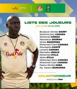 L’équipe guinéenne a bénéficié d’un stage bloqué de 10 jours au centre d’hébergement du Hafia FC, afin de mieux préparer cette CAN. Ce mercredi 9 juillet 2025, le sélectionneur Abdoul Aziz Sow a dévoilé la liste des 15 joueurs qui prendront part au tournoi prévu à Derna, en Libye.